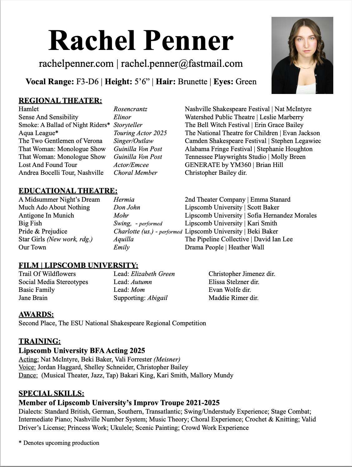 "Rachel is the ideal kind of artist you want to work with: focused, intentional, and one who takes the work seriously but not herself in it. I have had the pleasure of teaching her in several classes, and she pushes herself to take risks and dive into characterization."